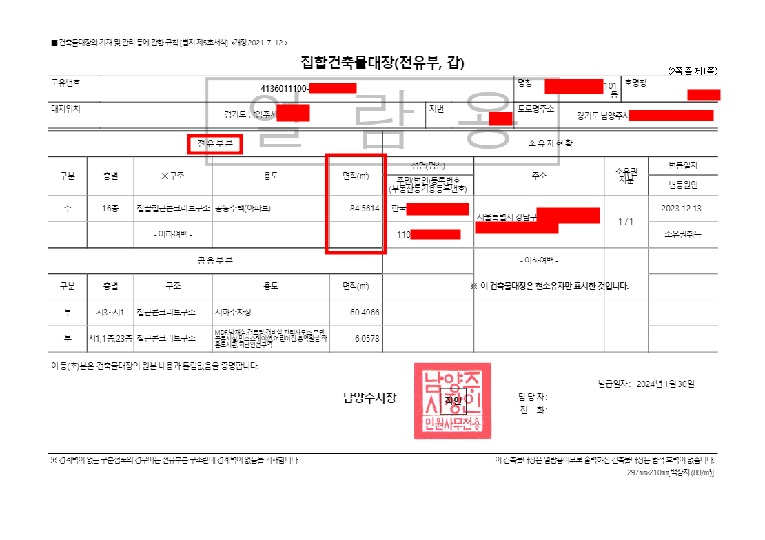 전용면적 확인방법은 건축물대장 발급받으시면 전유 부분에 면적에 숫자가 전용면적입니다.